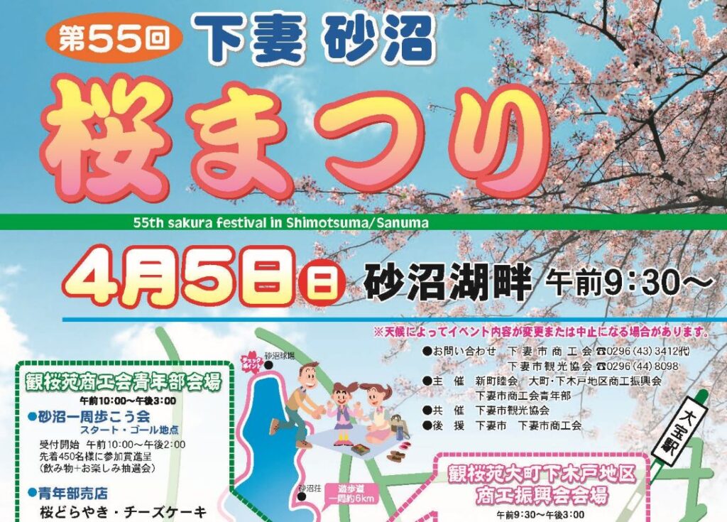 イベント 下妻で「砂沼桜まつり」 4月5日 歩く会、キッチンカー、カラオケ、ライトアップ…と盛りだくさん 砂沼湖畔