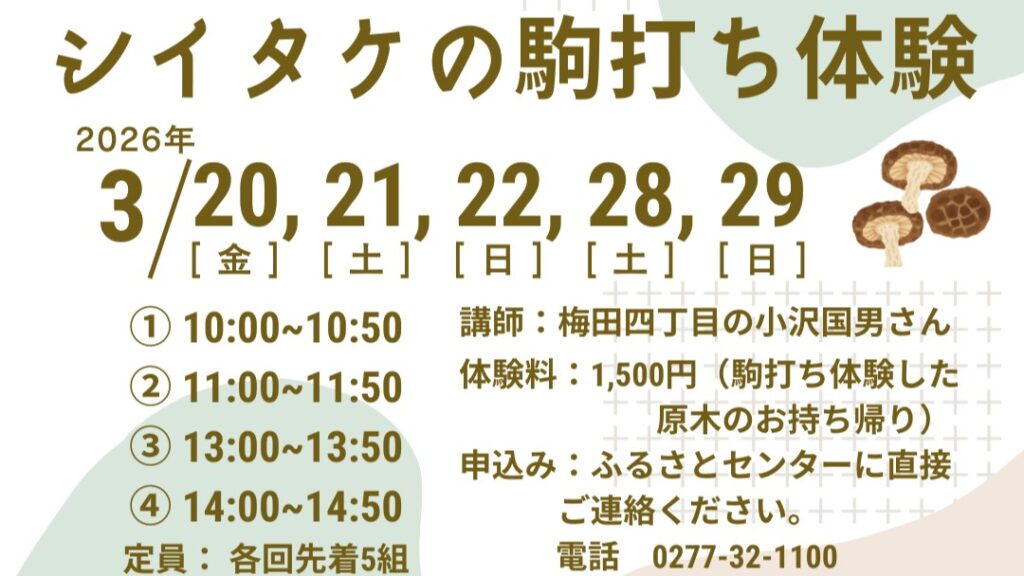 イベント シイタケが自宅で収穫できます! 桐生市で原木に駒打ち体験 3月20日~22日、28、29日の5日間