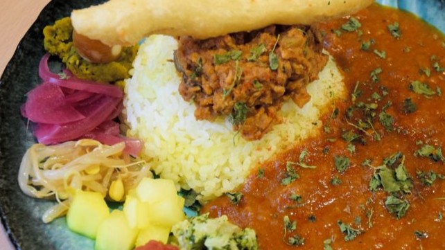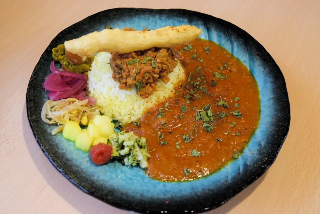 チキン、ラムを使ったソース系と、ひき肉を使ったキーマなど独自のアレンジで創作した3種のスパイスカレーは不定期で変わります。1種盛り(950円)、2種盛り(1200円)、3種盛り(1400円)が選べ、付け合わせは8種。