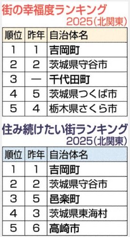 つくば市、さくら市、高崎市といった茨城、栃木、群馬の3県で存在感のある都市が多い中、幸福度が高い市町村に千代田町住み続けたい街に邑楽町が、それぞれ3位にランクインしました。