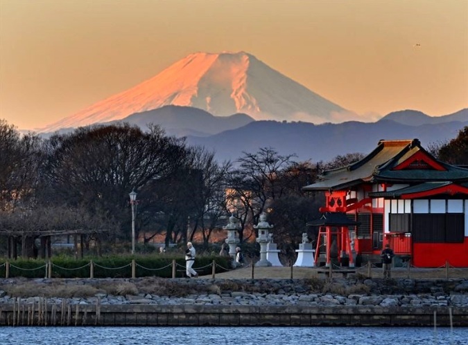 冬の澄んだ空気に浮かび上がる富士山と神社の風景