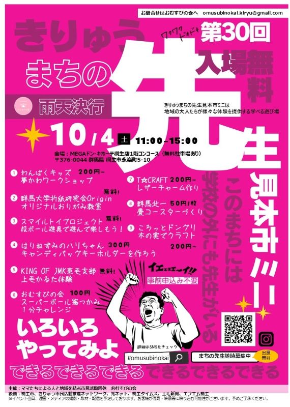 地域の大人たちが先生になる「第30回まちの先生見本市ミニ」が、10月4日に群馬県桐生市のMEGAドン・キホーテ桐生店で開催されます。