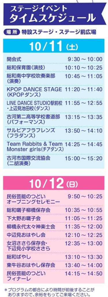 11日は、ダンスや演奏、パフォーマンスなど「ステージイベント」、12日はおはやし、みこしの練り歩きなど「民俗芸能のつどい」がメインになります。