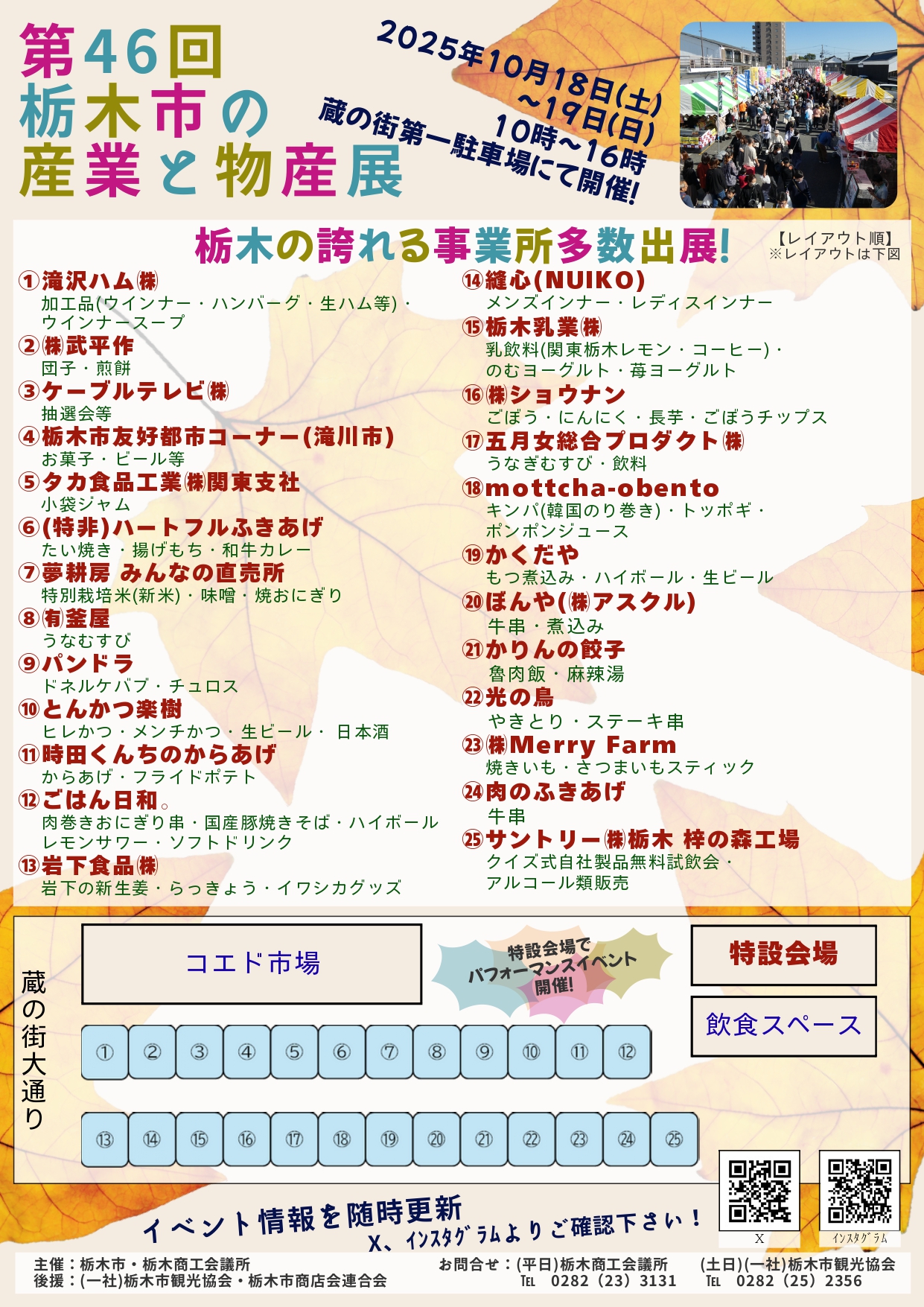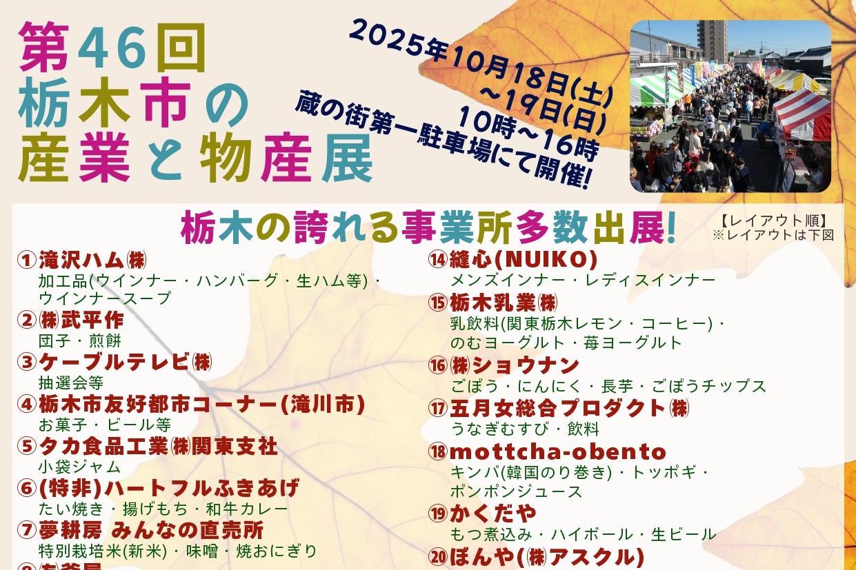 栃木市と栃木商工会議所の主催による「第46回栃木市の産業と物産展」は2025年10月18日(土)~10月19日(日)の両日、いずれも10:00~16:00の開催です。