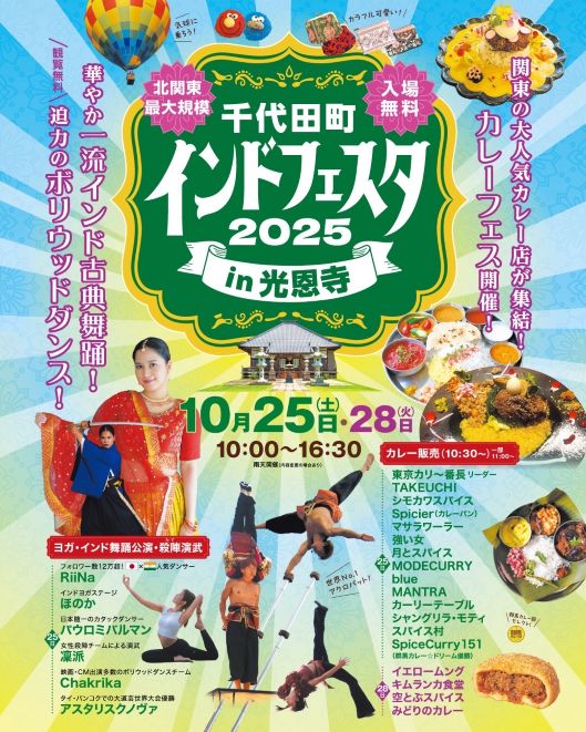 インド文化や食を体験できるイベント「千代田町インドフェスタ2025」が10月25日と28日に群馬県千代田町の光恩寺で開かれます。北関東最大規模のインド文化交流イベントとして2023年から毎年実施していて、今回で3回目。昨年は約5千人が訪れた大人気の催しです。