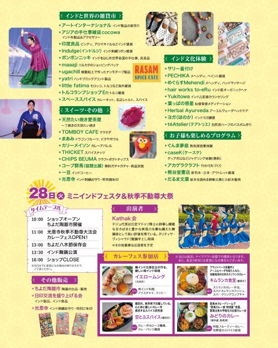 28日はミニインドフェスタと、光恩寺の秋季不動尊大祭。ちよだ陶器市も開かれ、味わい深いお皿がお手ごろ価格でずらりと並びます。