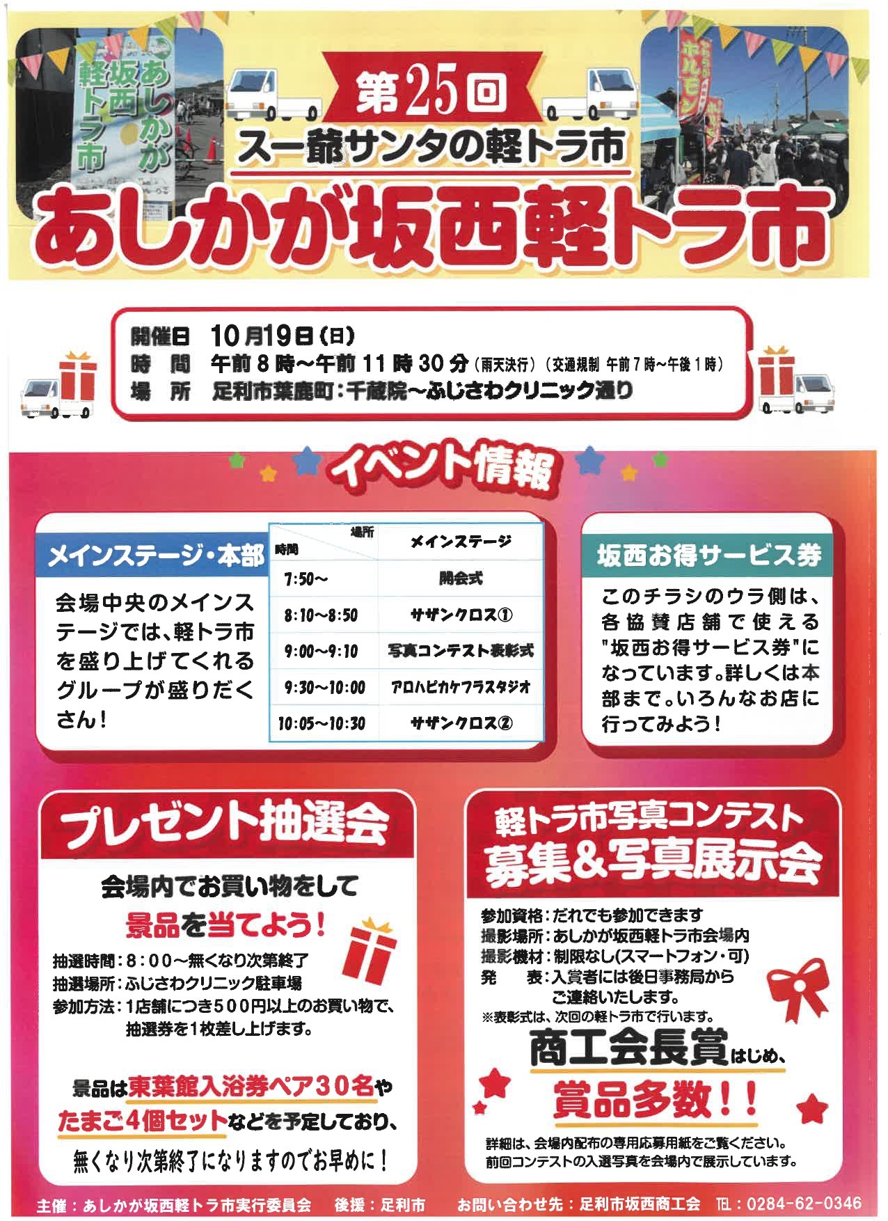 足利市坂西商工会などによる「第25回あしかが坂西軽トラ市」は2025年10月19日(日)8:00~11:30の開催です。雨天決行となります。