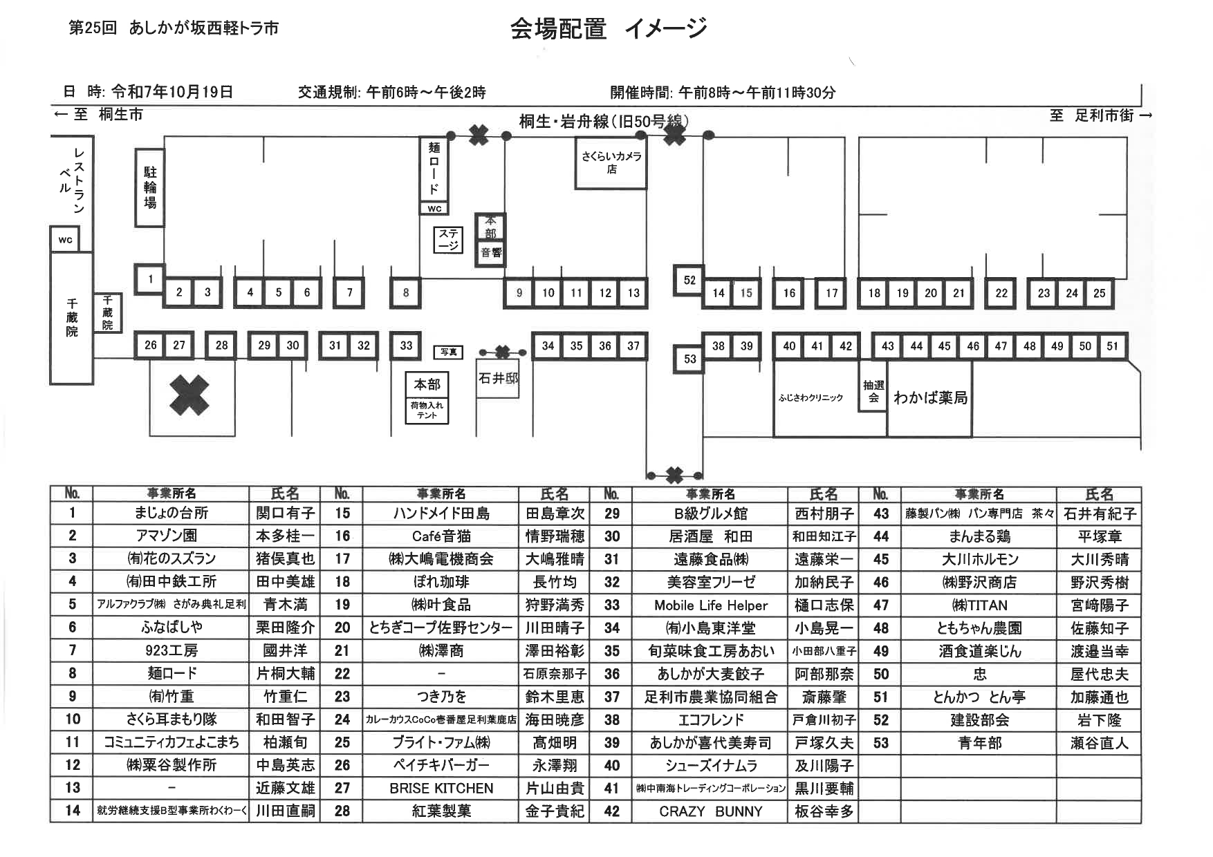 足利市坂西商工会のホームページ(https://www.ashikaga-sakanishi.net/)からも、出店者の一覧や会場配置図を見ることができます。