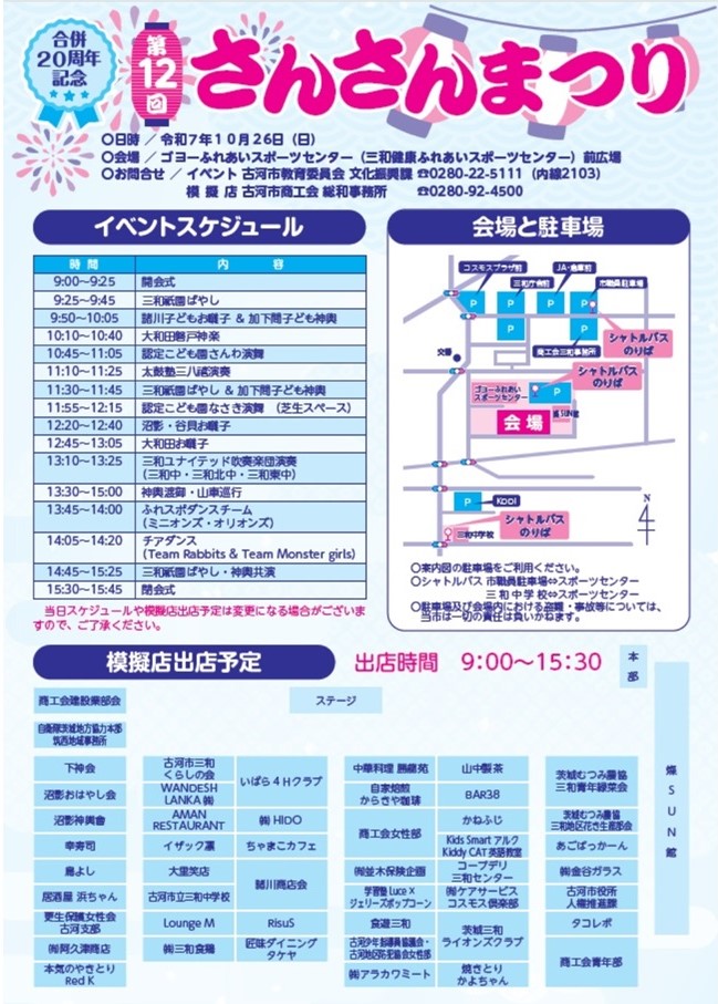 茨城県古河市三和地区の祭典「さんさんまつり」が2025年10月26日(日)、茨城県古河市仁連のゴヨーふれあいスポーツセンター(三和健康ふれあいスポーツセンター)前広場で開催されます。さんさんまつり実行委員会の主催で、今年で12回目になります。