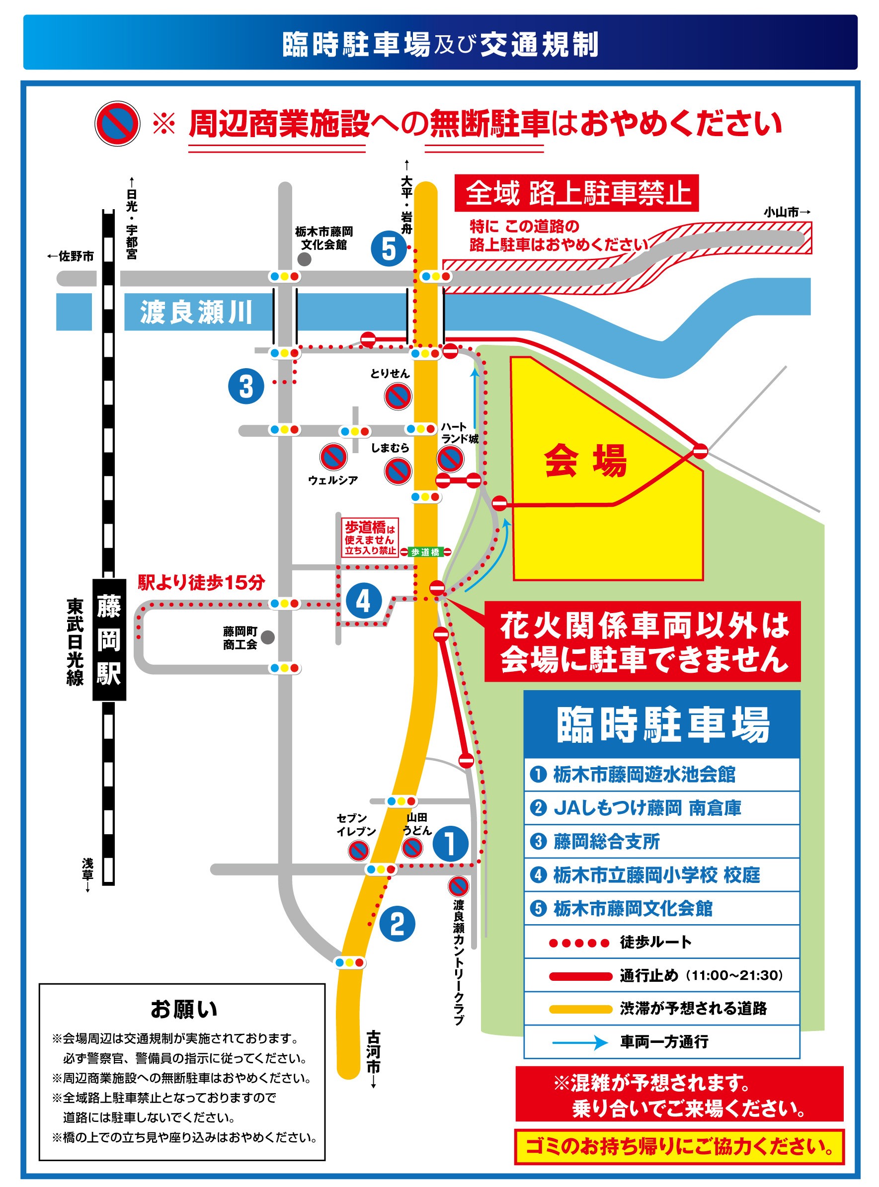 会場内には関係車両以外の進入はできませんが、周辺に一般観覧者用の臨時駐車場が5カ所用意されています。