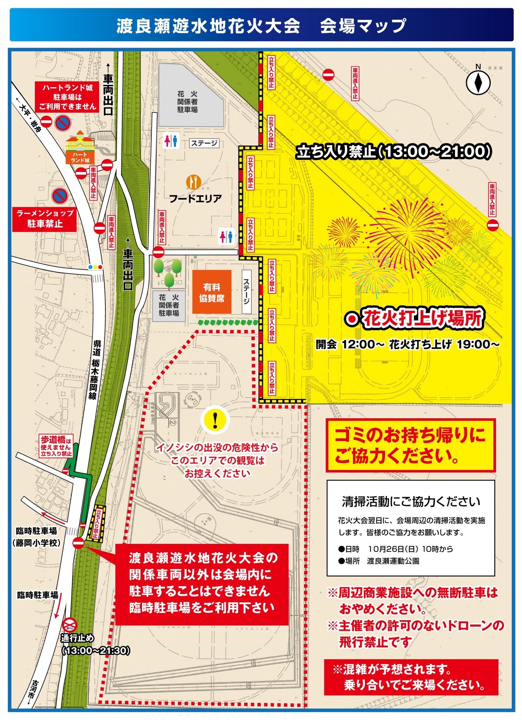 荒天で中止となった場合、花火は翌10月26日(日)に順延し、イベントは中止となります。
