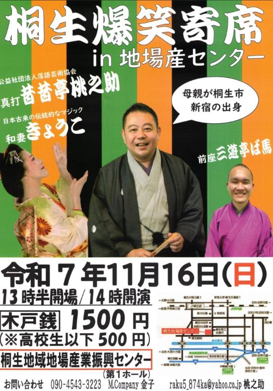 桐生市の桐生地域地場産業振興センターで、11月16日(日)に、「桐生爆笑寄席in地場産センター」が開催されます。