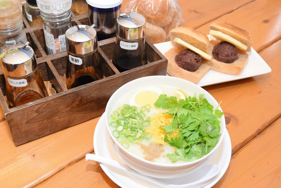 パクチーたっぷりのおかゆと手作りパンのあんバターサンド
