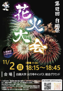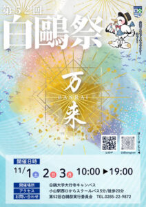 栃木県小山市の白鷗大学大行寺キャンパスで学園祭「第52回白鷗祭」が2025年11月1日(土)~3日(月・祝)の3日間にわたり開催されます。学生らによる教室企画やパフォーマンス、模擬店や花火大会など、来場者が楽しめるコンテンツが盛りだくさん!