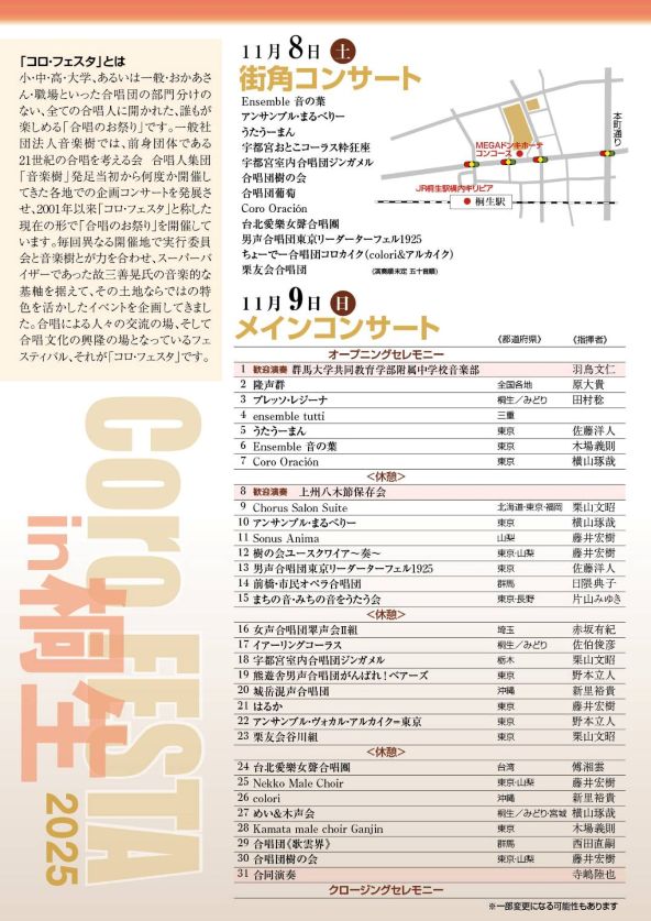 毎回異なる開催地で実施する合唱のお祭り「コロ・フェスタ2025in桐生」が11月8、9日の2日間にわたり、群馬県桐生市内各所で行われます。