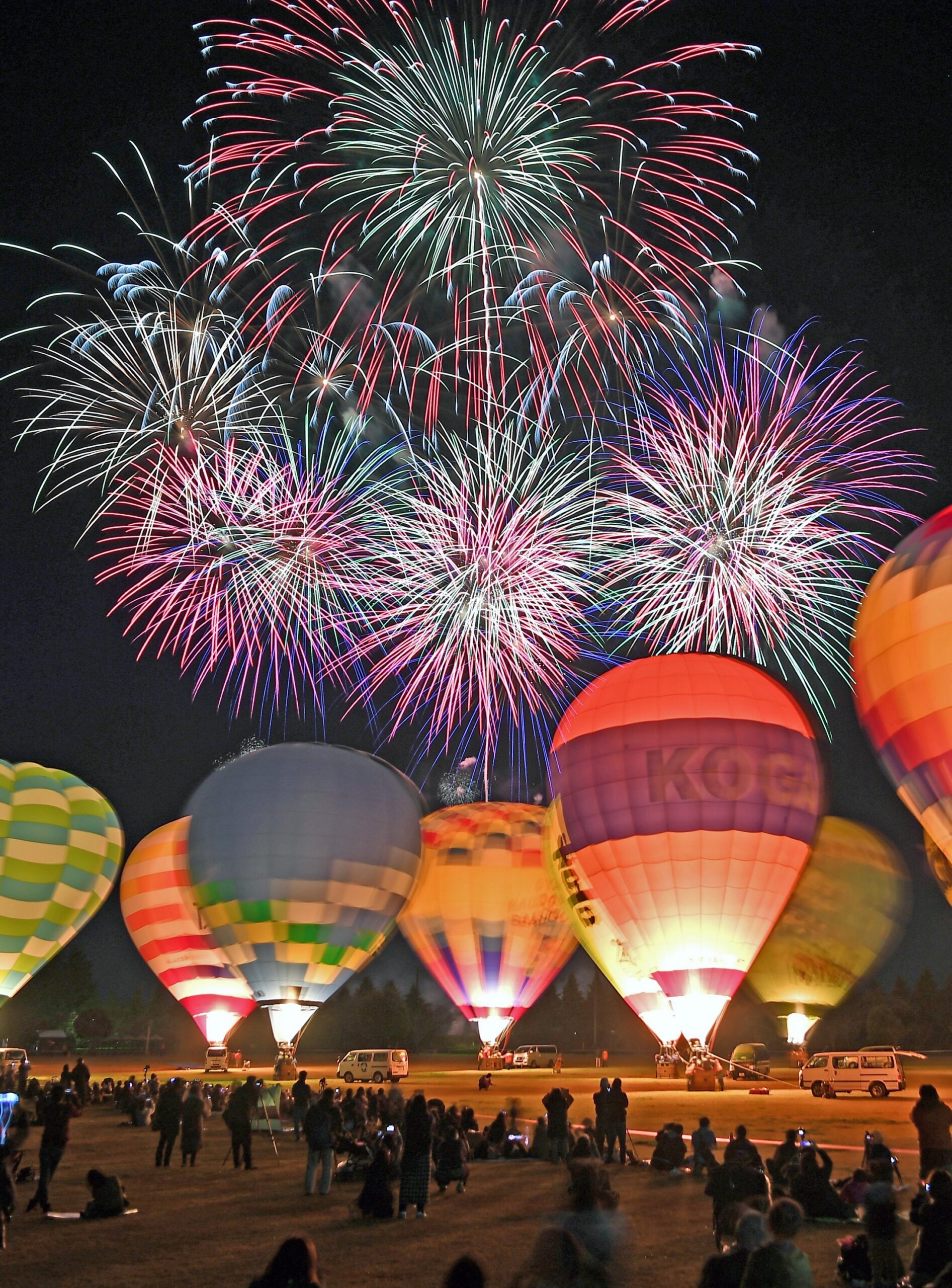 夜空を彩る熱気球と花火=2019年11月9日(下野新聞)