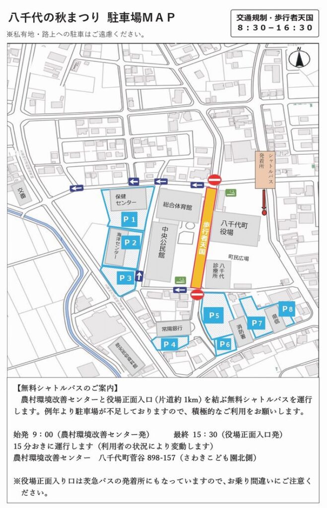 当日は会場のメインストリートが午前9時半から午後4時半まで交通規制され、歩行者天国になります。周辺の駐車場に限りがあるため、農村環境改善センターと八千代町役場正面入り口を結ぶ無料シャトルバスが午前9時から午後3時半まで約15分間隔で運行されます。