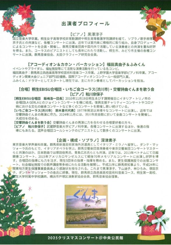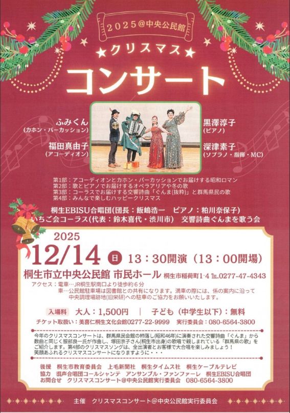 チケットの取り扱い:美喜仁桐生文化会館(☎0277-22-9999)、クリスマスコンサート@中央公民館実行委員会(☎080-6564-3800)