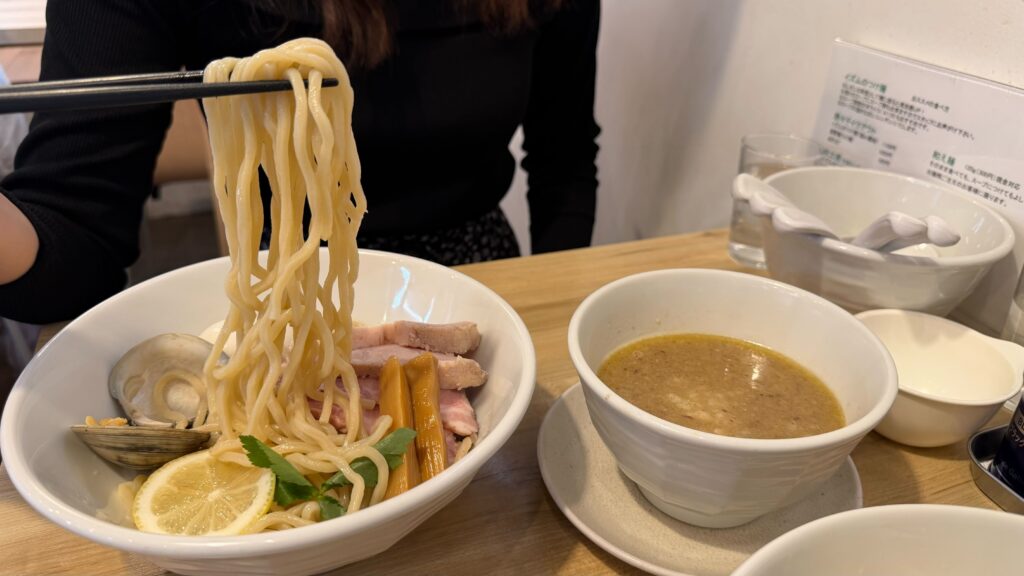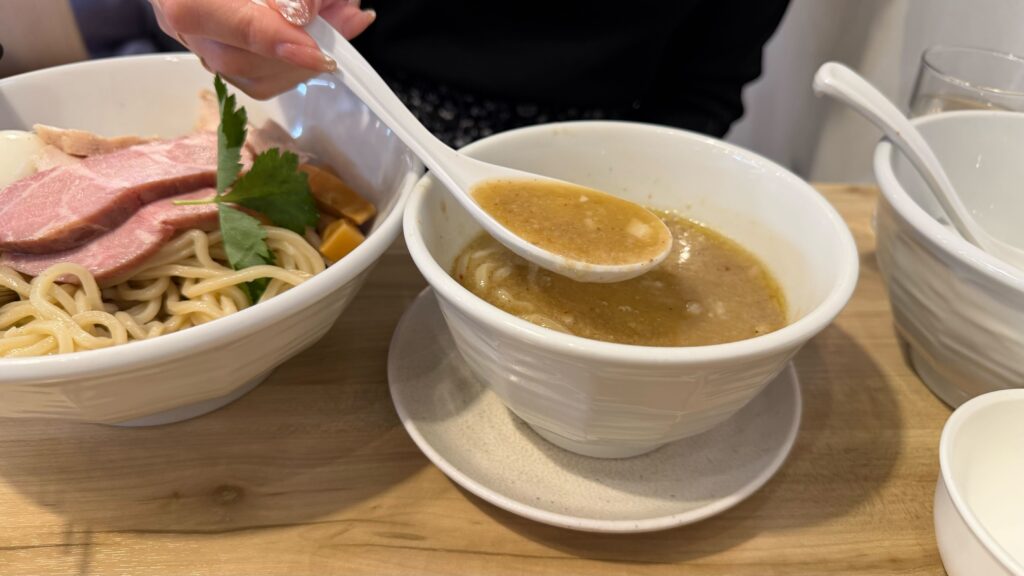 つけ汁にくぐらせた瞬間、スープがしっかり絡んで、口の中いっぱいに旨味が広がるの💓
