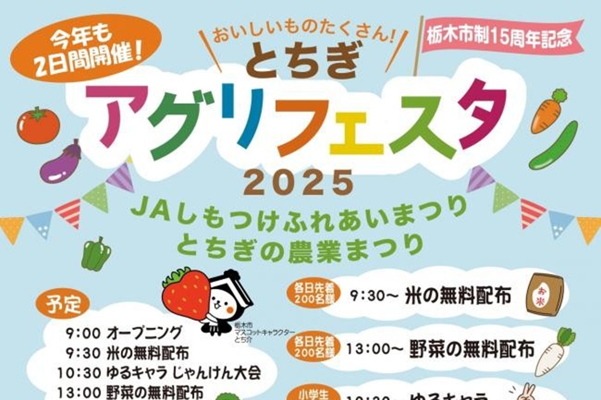 栃木県栃木市の大平運動公園で11月22日(土)、地元産農産物や加工品の販売などを行う「とちぎアグリフェスタ2025」が開催されます。お米と野菜の無料配布あり、抽選会ありのうれしいイベントです。