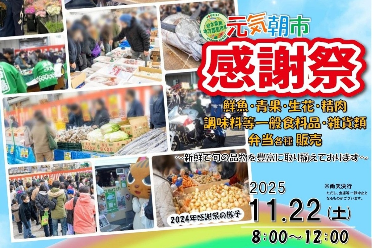2025年は11月22日(土)に開催される栃木県南地方卸売市場の「感謝祭」。