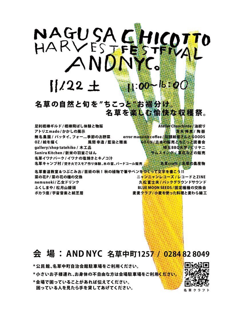 栃木県足利市名草中町のカフェ「AND NYC」で11月22日(土)、名草地区の自然と旬を味わう「名草ちこっと収穫祭」が開催されます。この記事では、イベント内容や出店者などについてご紹介します。