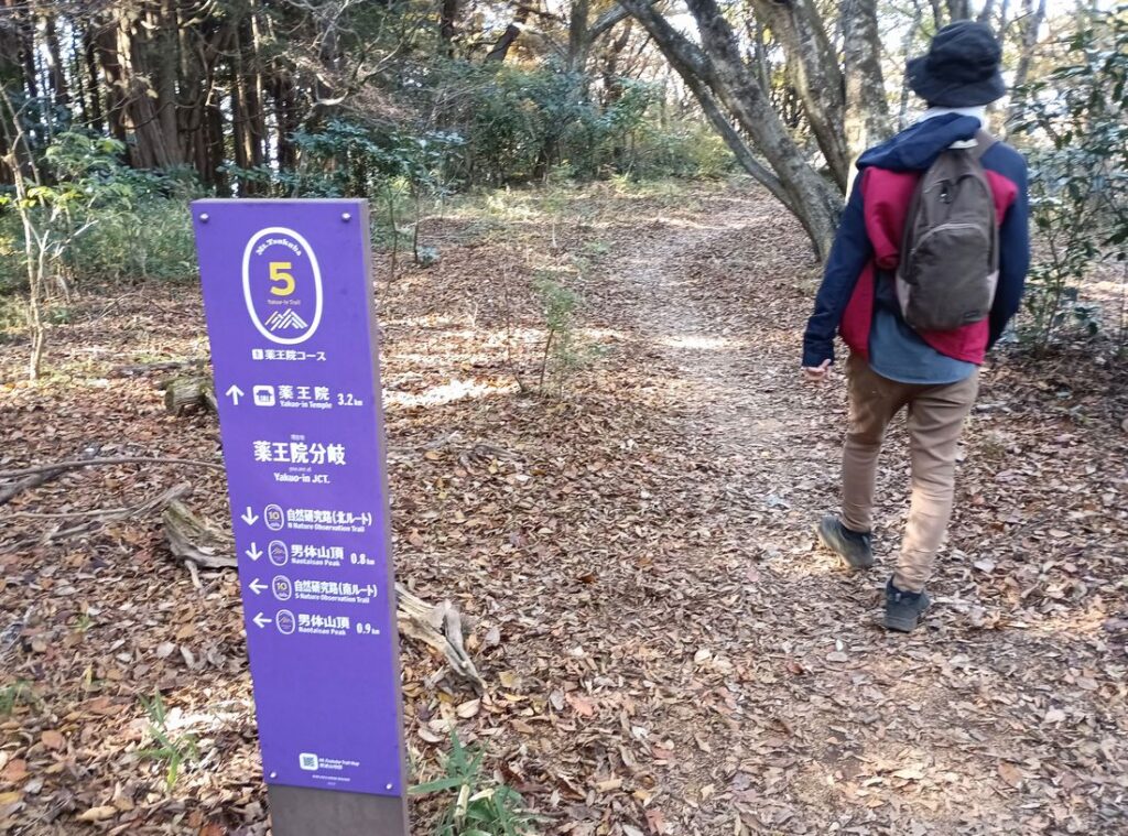 「薬王院コース」は終わり、御幸ケ原から「山頂連絡路」を通って女体山(標高877メートル)を目指します。岩場もありますが整備されたコースで、距離約550メートル、所要時間約15分になります。ケーブルカーやロープウエーで来て、カジュアルな格好で歩いている人も少なくなく、ペット連れの人もいます。