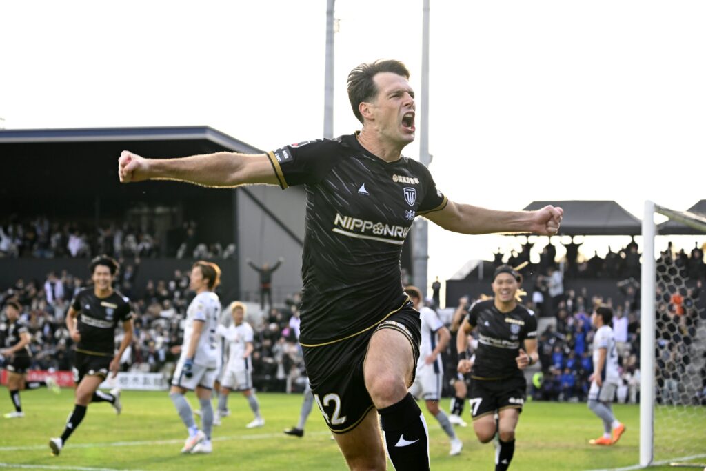 引き分け以上でJ2昇格が決まる試合。無得点のまま時間が進みましたが、後半11分にDFマテイ・ヨニッチ選手のゴールで先制しました。