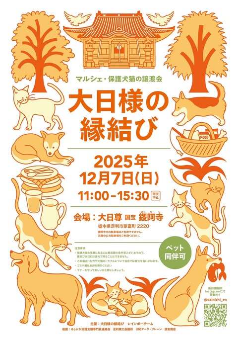 マルシェと保護犬猫の譲渡会を兼ねたイベント「大日様の縁結び」が12月7日(日)、栃木県足利市の国宝鑁阿寺(大日尊)で開催されます。くわしい内容や参加団体・出店者についてご紹介します。