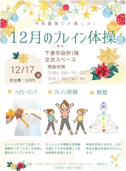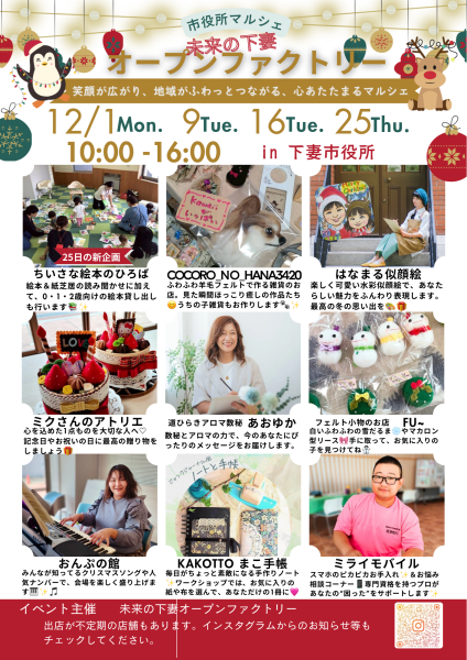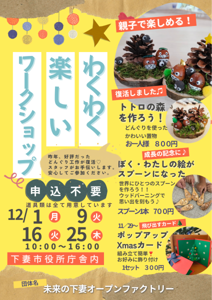 2025年12月も「わくわく楽しいワークショップ」(16、25日午前10時~午後4時)、「オープンファクトリー」(16、25日午前10時~午後4時)、「ブレイン体操」(17日午前10時~11時、午後1時半~2時半)、市民交流会(26日午前10時半~正午)、「公園カフェてふてふ水曜日の下妻市役所」(17日午前11時半~午後1時半)と、多彩な内容になっています。