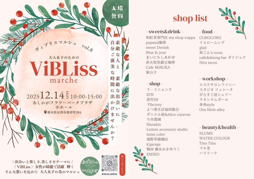 大人の女性向けマルシェイベント「ViBLissマルシェvol.8」が12月14日(日)、栃木県足利市のあしかがフラワーパークプラザ(足利市民プラザ)小ホールで開催されます。内容や参加店舗についてお伝えします。