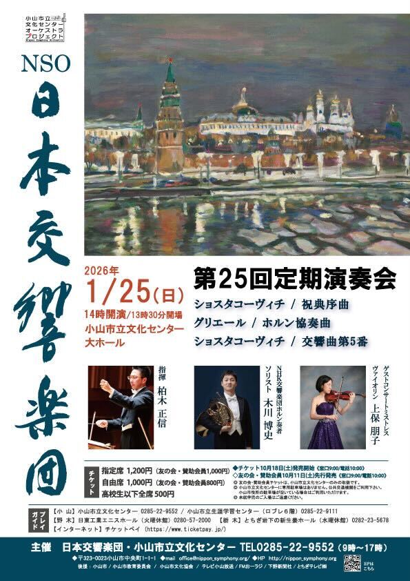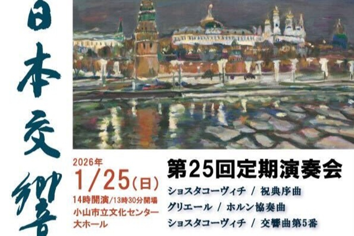 栃木県小山市で活動する日本交響楽団による定期演奏会が2026年1月25日(日)、小山市立文化センター大ホールで開催されます。新年最初の定期演奏会となり、ただいまチケット販売中です。