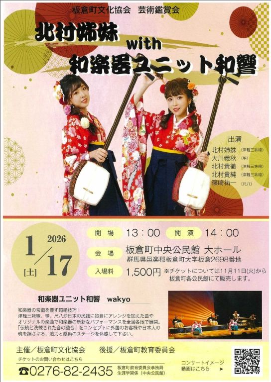 板倉町文化協会の芸術鑑賞会「北村姉妹with和楽器ユニット和響」が1月17日、群馬県板倉町の板倉町中央公民館で開かれます。