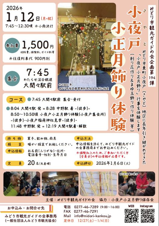 申し込み:名前(ふりがな)、住所、電話番号、性別、生年月日を添えて1月6日までに、みどり市観光ガイドの会事務局まで申し込む