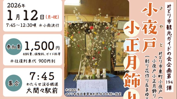 みどり市観光ガイドの会主催企画「小夜戸小正月飾り体験」が1月12日、群馬県みどり市の小夜戸集会所で開かれます。