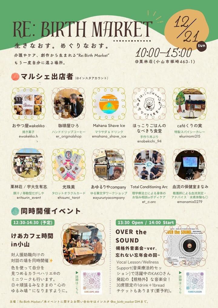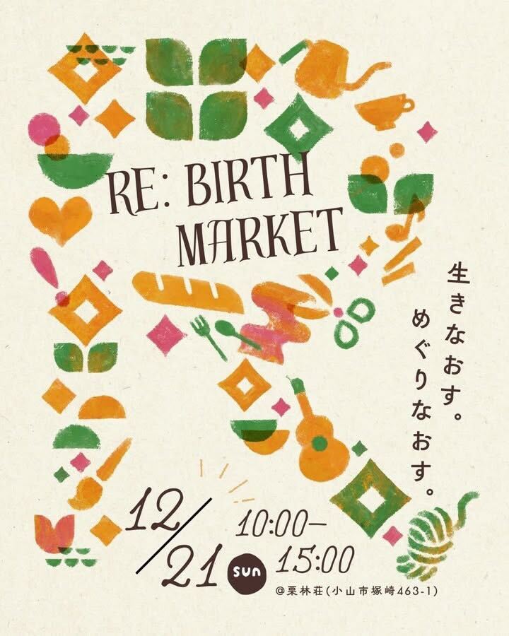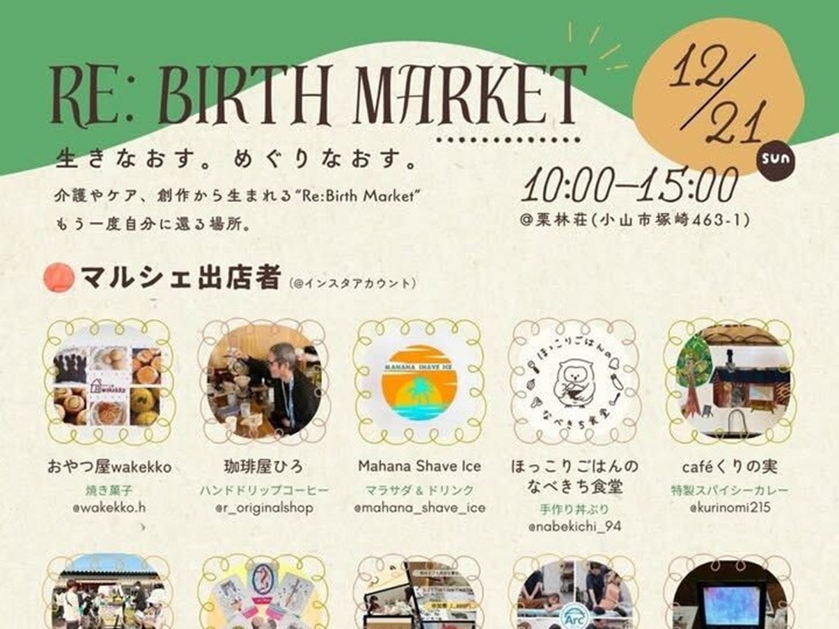 栃木県小山市塚崎にある特別養護老人ホーム栗林荘(りつりんそう)にて12月21日(日)、マルシェイベント「RE: BIRTH MARKET」が初開催されます。テーマは「生きなおす。めぐりなおす。」。少し立ち止まり、自分自身を整える時間をそっと差し出してくれるマルシェです。