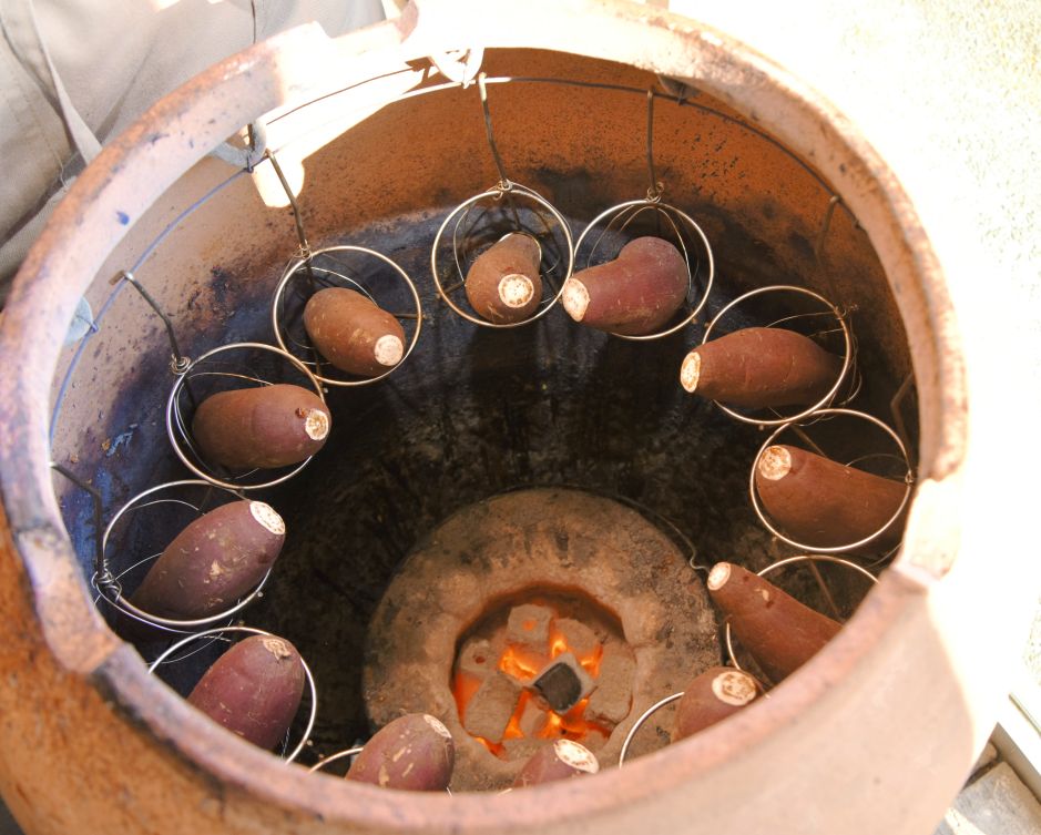 使用するサツマ芋は、茨城県産のねっとりとした「紅はるか」と、千葉県産のしっとりとした「シルクスイート」。底に炭を置いたつぼの中に芋を並べ、2時間ほどかけてじっくり焼き、さらに低温で熟成させます