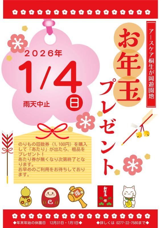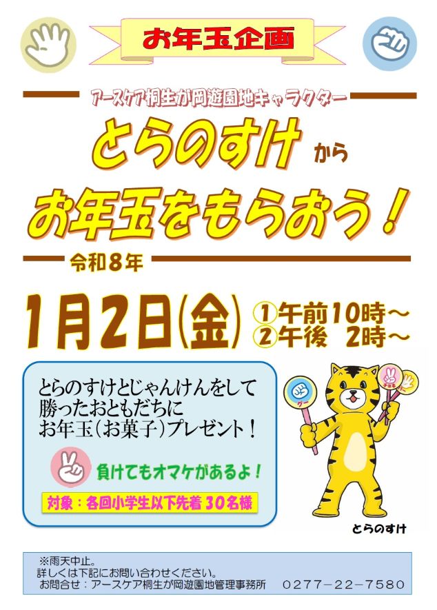 小学生以下の来園者を対象に、アースケア桐生が岡遊園地のキャラクター、とらのすけとじゃんけんをして勝ったらお年玉(お菓子)をプレゼントします。