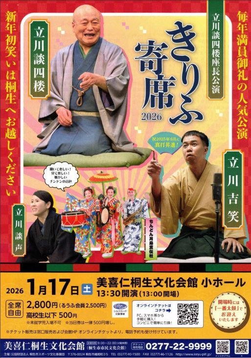 毎年満員御礼の人気公演「立川談四楼座長公演 きりふ寄席2026」が1月17日、群馬県桐生市の美喜仁桐生文化会館で開催されます。