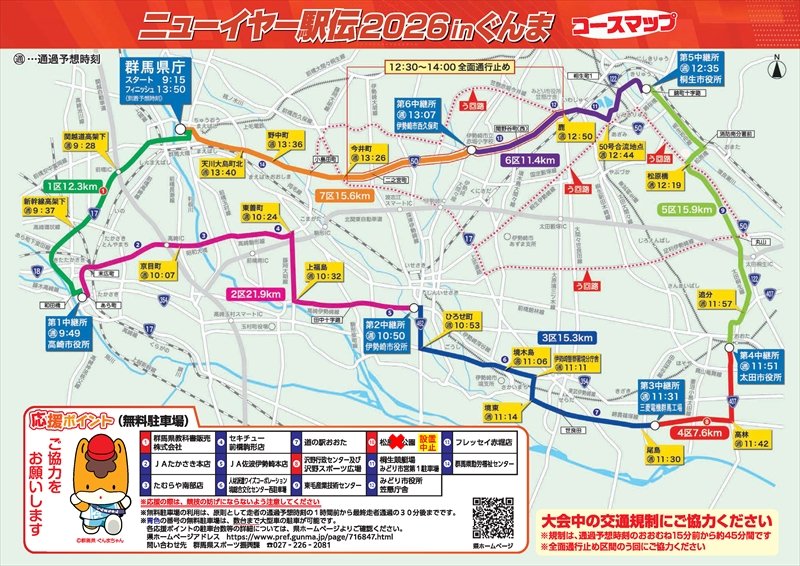当日は沿道に駆けつける人のために応援ポイント(無料駐車場)が開放されます。道の駅おおた、東毛産業技術センター(太田市吉沢町)、みどり市役所笠懸庁舎など。