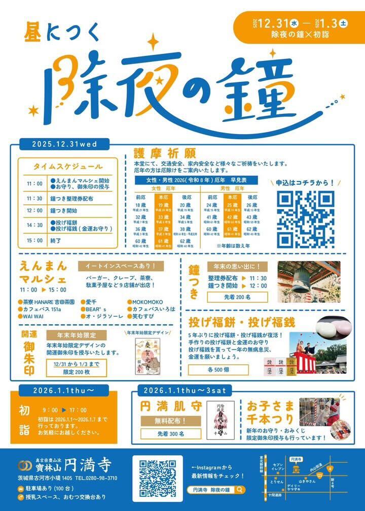 境内では12月31日(水)、年末年始限定デザインの御朱印の配布や、古河市周辺で活躍するお店が集まる「えんまんマルシェ」も予定され、にぎやかな一日になりそうです。
