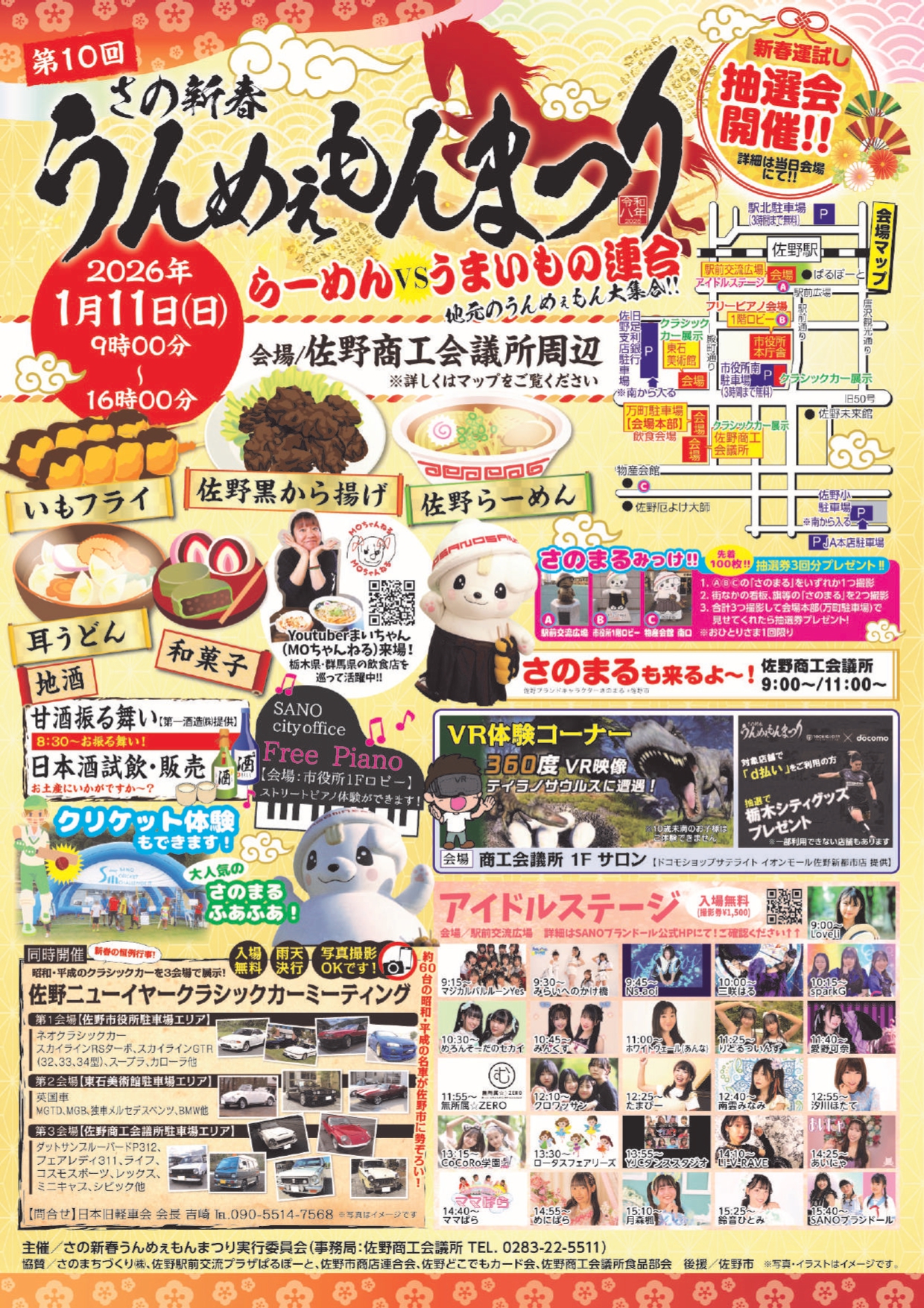 佐野市の年明け恒例イベントとなりつつある「さの新春うんめぇもんまつり」。記念すべき第10回の開催日時は、2026年1月11日(日)9:00~16:00です。
