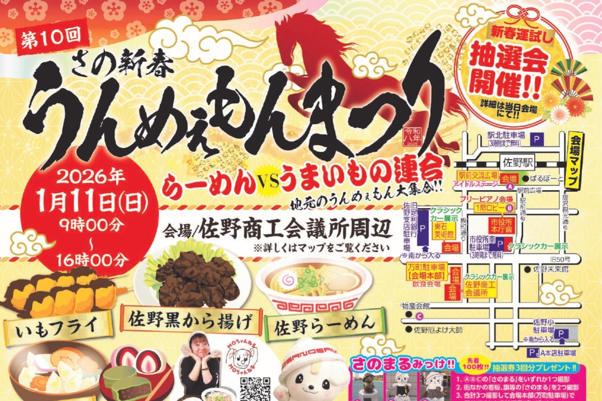 栃木県佐野市の中心部で1月11日(日)、佐野らーめん、いもフライなどのご当地グルメが集結する「第10回さの新春うんめぇもんまつり」が開催されます。正月休み明け早々に訪れる3連休の中日。2026年を実りある一年にするためにも、美味しい食でパワーを充電しておきたいところです。
