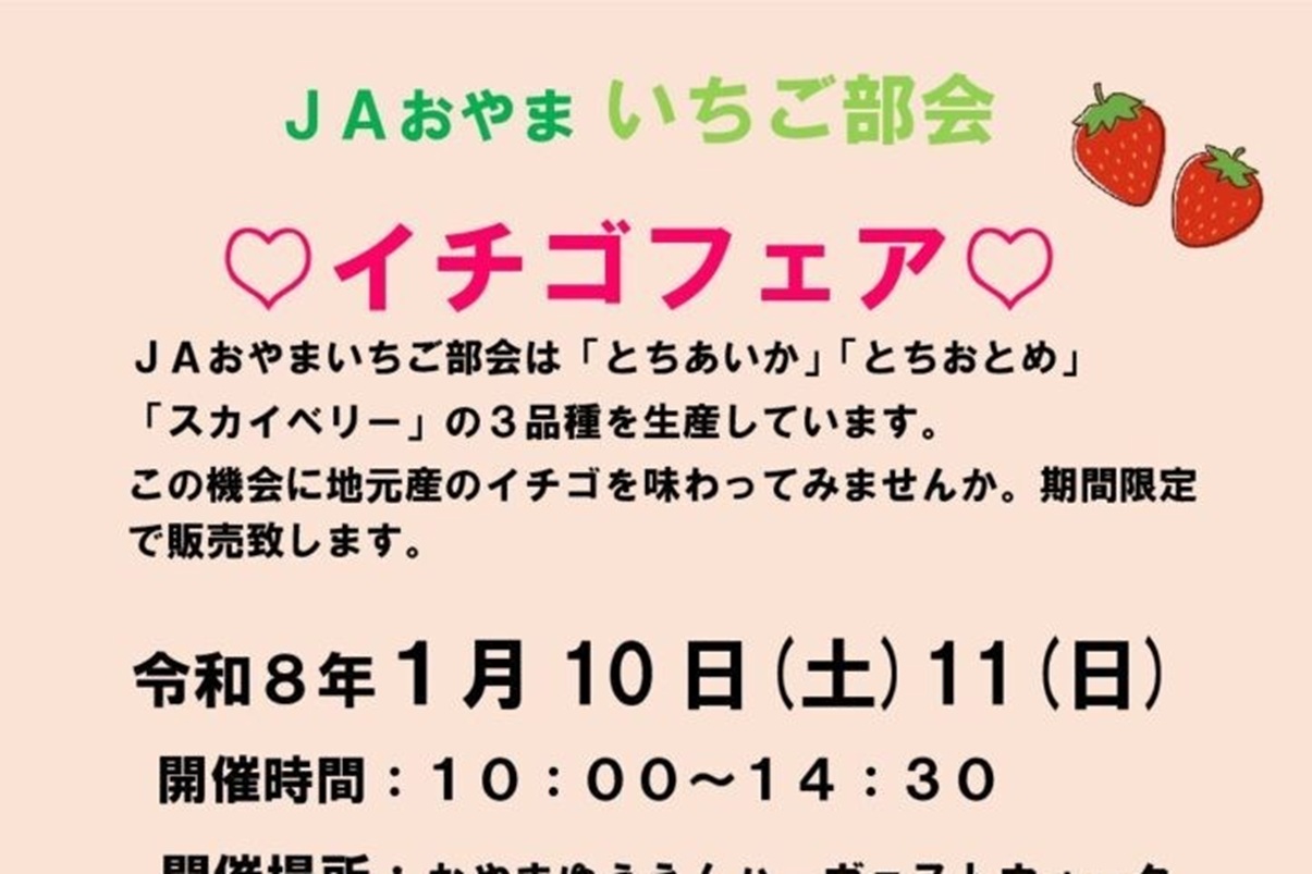 栃木県小山市のおやまゆうえんハーヴェストウォークで1月10日(土)~11日(日)の2日間、「イチゴフェア」が開催されます。JAおやま管内で収穫されたばかりの新鮮で旬のいちごを手に入れるチャンスです。