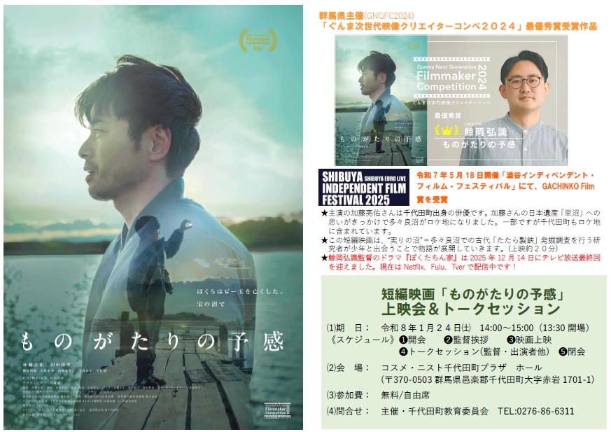 群馬県千代田町出身の俳優・加藤亮佑さんが主演の短編映画「ものがたりの予感」の上映会が、1月24日(土)に開催されます。会場はコスメ・ニスト千代田町プラザで、入場は無料。自由席なので気軽に立ち寄れるのがうれしいポイントです。