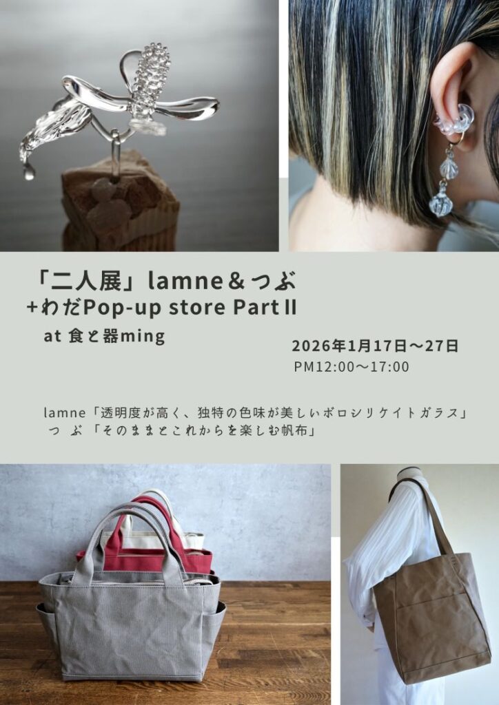 「『二人展』lamne&ツブ+わだPop-up store Part Ⅱ」が1月17日から27日まで、群馬県桐生市の「食と器ming」で開催されます。
