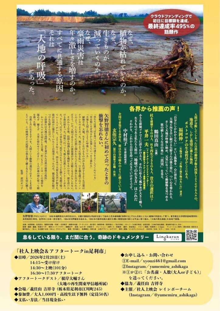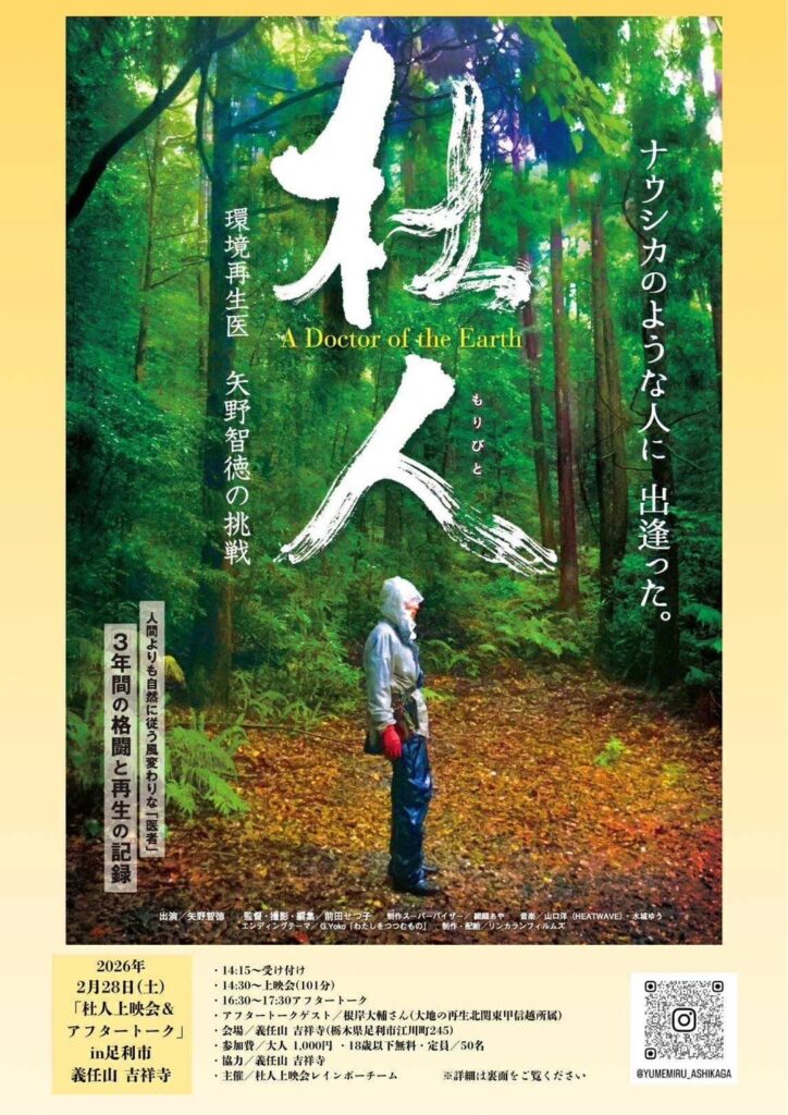 栃木県足利市江川町の義任山吉祥寺で2月28日(土)、造園家で環境再生医の矢野智徳(やの・とものり)さんの活動に密着したドキュメンタリー映画「杜人(もりびと)」の上映会とアフタートークが開催されます。チケットの予約販売が始まっていますので、ご興味のある方はお早めに。