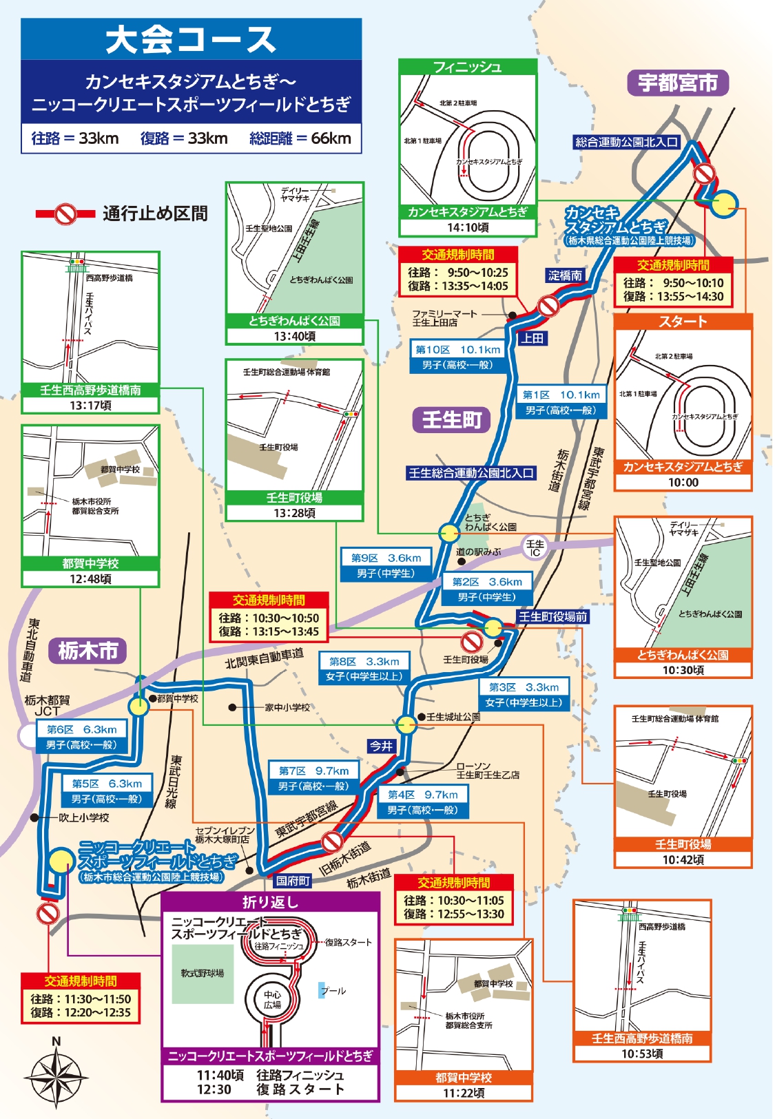 旧栃木街道、栃木市総合運動公園前の道路などでは通行止めがあり、そのほかの道路でも、ランナーの進行方向の車線や交差点で規制が敷かれます。