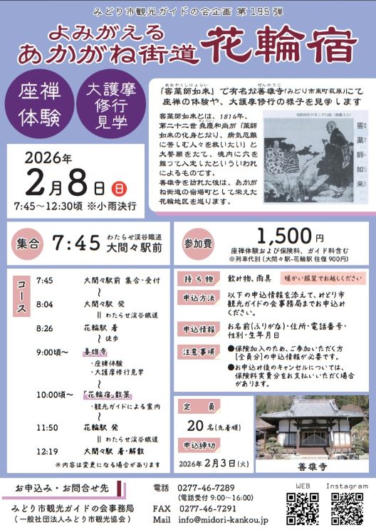 みどり市観光ガイドの会企画第195弾「よみがえるあかがね街道・花輪宿」が2月8日、群馬県みどり市で開催されます。