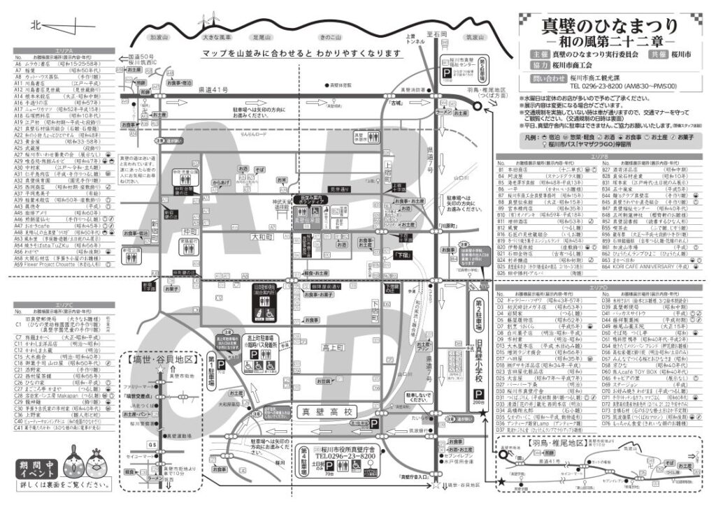 駐車場は、高上町駐車場(桜川市真壁町真壁279-1)が普通車1台500円、旧真壁小学校(同市真壁町田25)が無料で利用可能できるほか、真壁高校、桜川市役所真壁庁舎など複数用意されます。